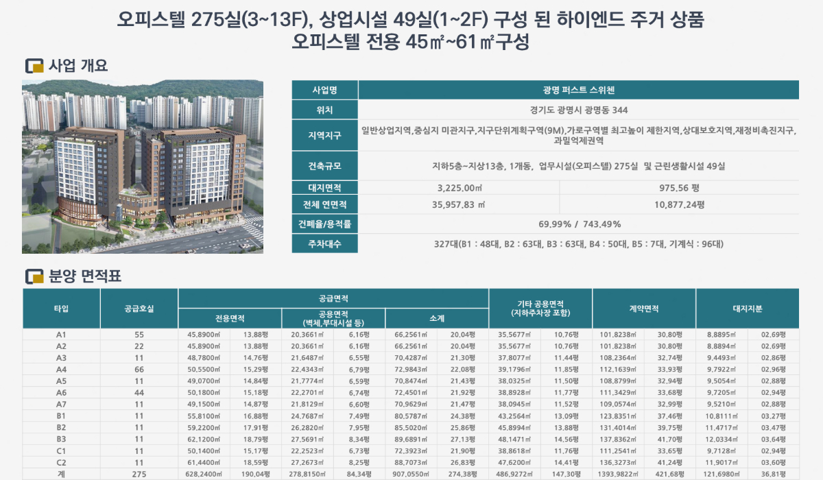 광명 퍼스트 스위첸 오피스텔은 업무 중심보다는 주거 활용을 고려한 구성으로 분류할 수 있으며, 이러한 성격은 이후 면적 구성과 평면에서도 확인됩니다.